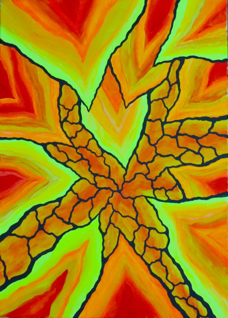 In diesem abstrakten Gemälde verschmelzen Flammen und Glut zu einer dynamischen Komposition, die den Betrachter in ihren Bann zieht. Die leuchtenden Orange- und Gelb-Töne strahlen Wärme und Energie aus. Die kräftigen Farben erzeugen eine Atmosphäre von Leidenschaft und Intensität.