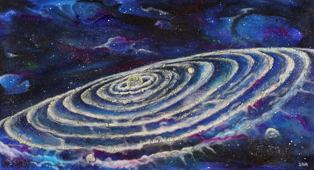 Unter UV-Licht offenbart das Gemälde seine wahre Pracht: Die Farben leuchten intensiver, die weißen Ringe strahlen förmlich und lassen das gesamte Werk in einem neuen Licht erstrahlen. Diese besondere Eigenschaft macht das Gemälde zu einem faszinierenden Erlebnis, sowohl im normalen Licht als auch unter UV-Bedingungen, und lädt den Betrachter ein, immer wieder neu in die unendlichen Weiten des Universums einzutauchen.
