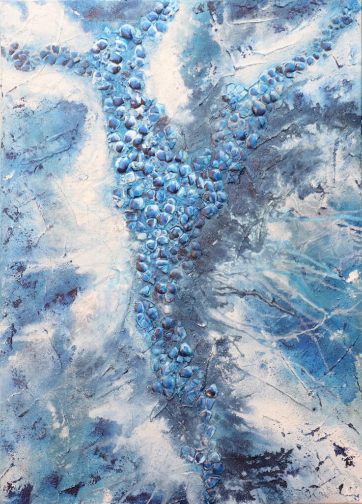 In der Mitte des Werkes liegt eine Anhäufung von Eierschalen, die wie eine schmale Insel aus der kühlen Umgebung hervorzutreten scheint. Diese fragilen, zerbrechlichen Elemente erzeugen einen starken Kontrast zu dem rissigen, eisartigen Blau, das die umliegende Fläche dominiert. Die Risse und Einschlüsse im Blau erinnern an die zerklüftete Oberfläche von gefrorenem Wasser, was dem Bild eine gewisse Kälte und Abgeschiedenheit verleiht.