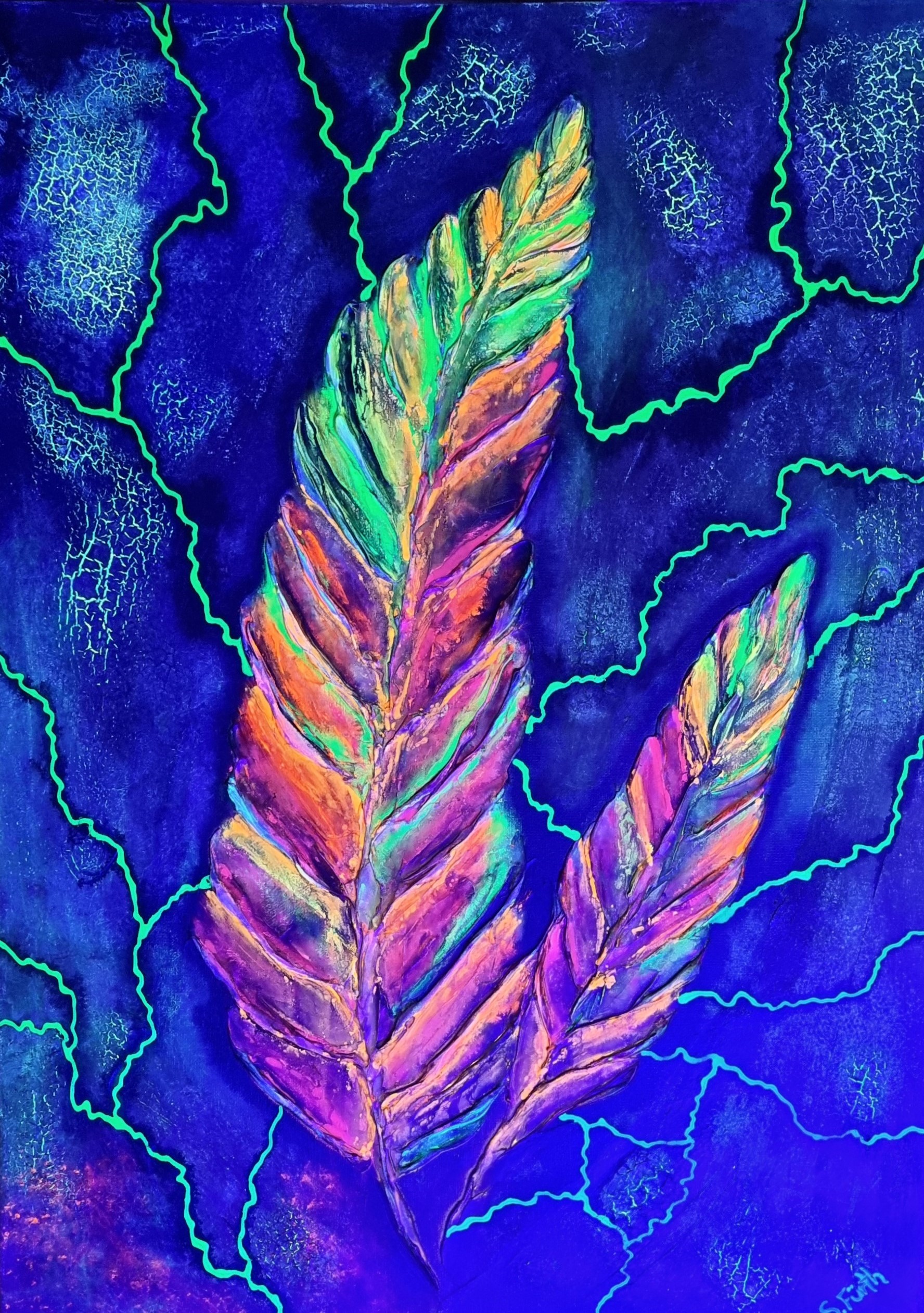 Bei Betrachtung unter Schwarzlicht entfaltet das Gemälde eine faszinierende neue Dimension. Die grünen Akzente des rissigen Hintergrunds und die filigranen Adern beginnen zu leuchten und schaffen ein beeindruckendes visuelles Spektakel. Auch die Federn kommen in diesem neuen Licht zur Geltung und zeigen eine erstaunliche Farbenpracht, die im normalen Licht verborgen bleibt. Diese geheimnisvolle Veränderung lädt den Betrachter dazu ein, die Vielschichtigkeit und die verborgenen Details des Kunstwerks zu erkunden.