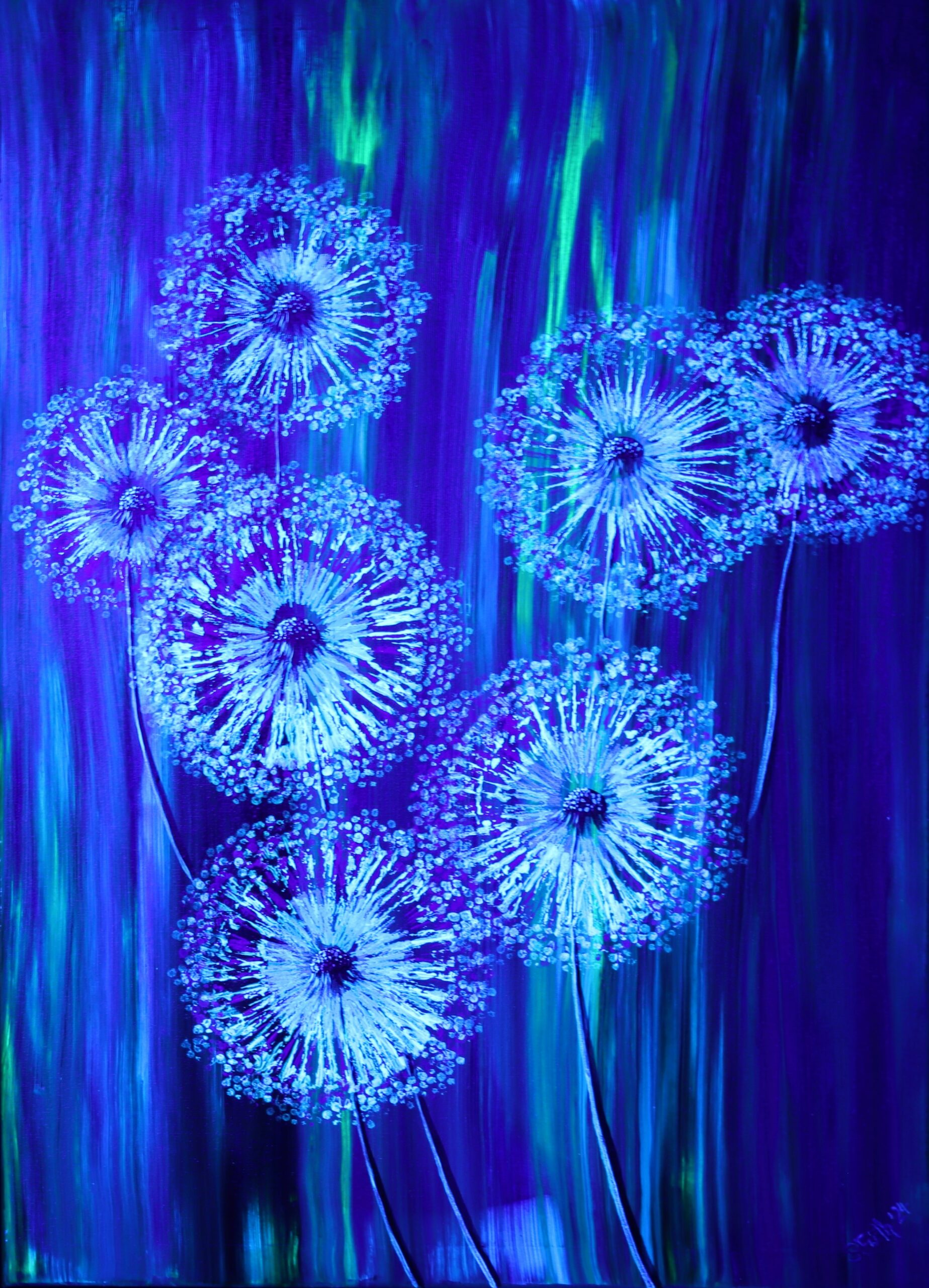 Unter Schwarzlicht entfaltet das Kunstwerk eine ganz neue Dimension. Leider konnte die Kamera dies nicht einfangen! Die verschiedenen Nuancen von Grüngelb und Blau beginnen zu leuchten und schaffen ein strahlendes Spiel von Licht und Schatten. Die Pusteblumen erscheinen noch greifbarer und lebendiger, als ob sie im Begriff sind, sich im nächsten Moment zu entfalten und in den Raum hinauszuschweben. Diese transformative Wirkung verstärkt das Gefühl von Frische und Lebendigkeit, das das Bild vermittelt, und lädt den Betrachter ein, die Schönheit der Natur in ihrer fragilen Eleganz zu bewundern.