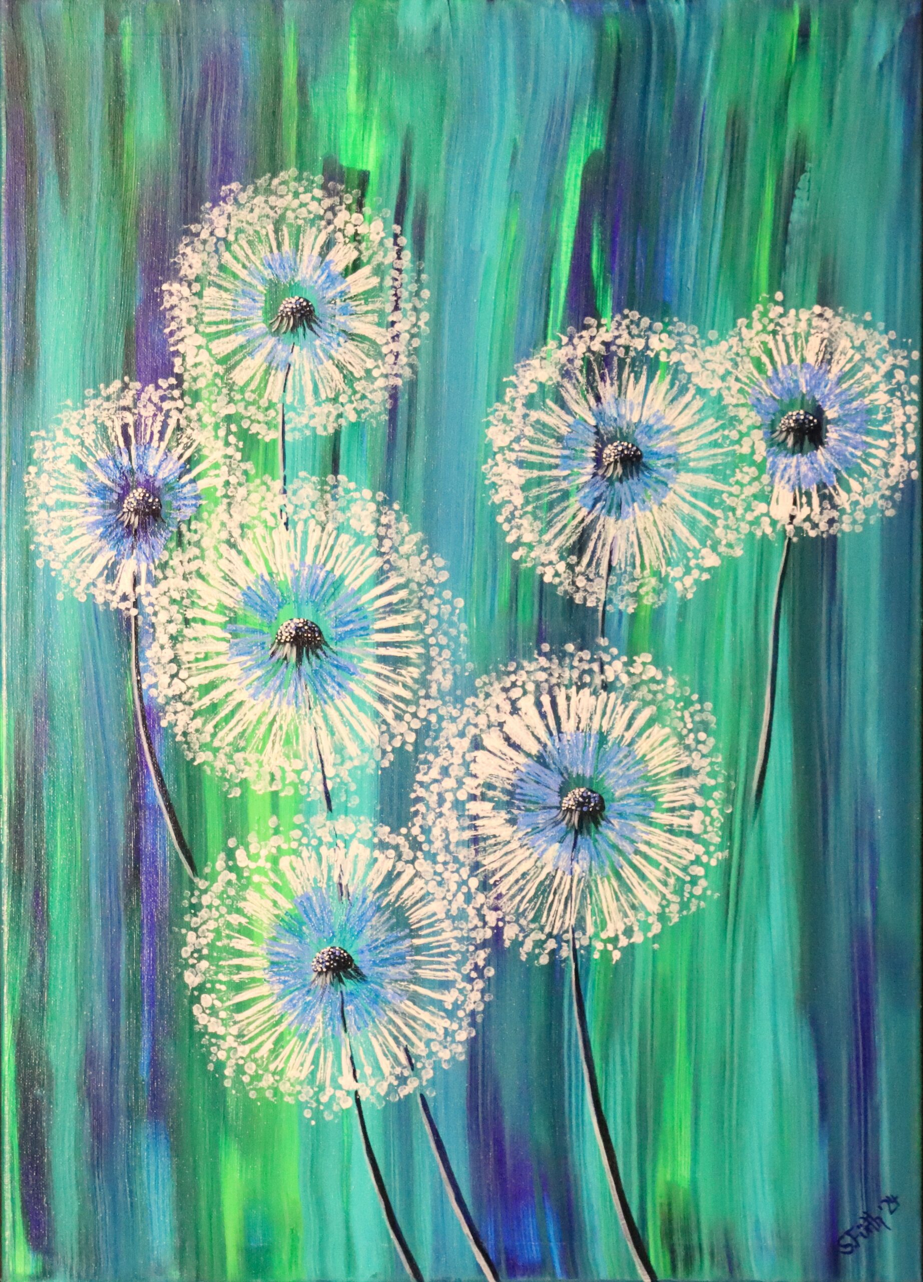 Das Gemälde zeigt eine faszinierende Komposition von Pusteblumen, die vor einem blaugrünen Hintergrund erblühen. Die harmonische Farbpalette vermittelt eine erfrischende und lebendige Atmosphäre, die den Betrachter sofort in ihren Bann zieht. Die zarten, weißen Köpfe der Pusteblumen scheinen fast zu schweben, während sie sich kontrastreich von den intensiven Grüntönen abheben.