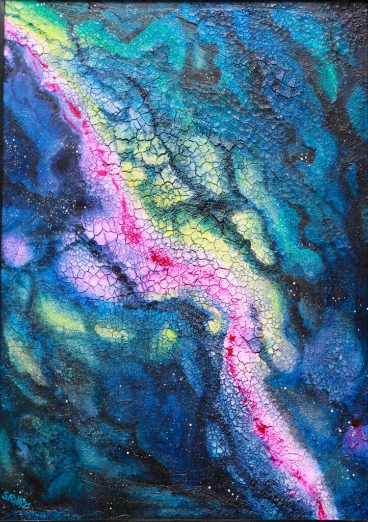 Das Acrylbild entführt den Betrachter auf eine faszinierende Reise ins Weltall. Die Verwendung von rissiger Paste verleiht der Oberfläche eine einzigartige Textur, die die Unendlichkeit des Universums symbolisiert. Diagonal durch das Bild zieht sich ein leuchtender pinkfarbener Bereich, der an seinen Rändern sanft in ein warmes Gelb übergeht. Dieser Farbverlauf bildet einen kraftvollen Kontrast zum tiefen Blau des Himmels, das die Weite und Mystik des Universums widerspiegelt.