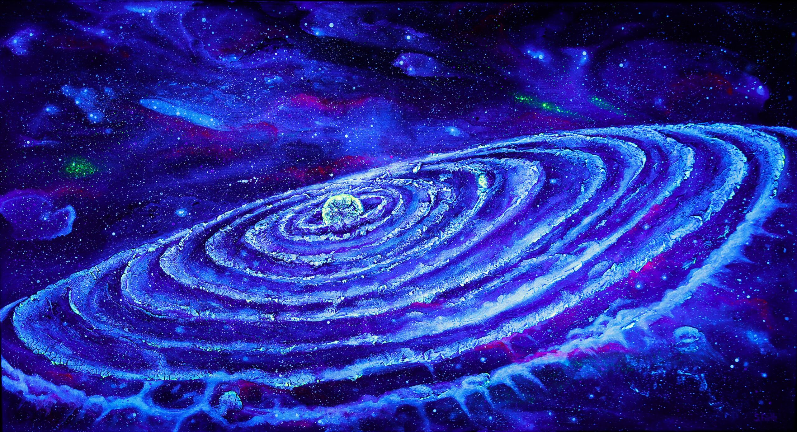 Unter UV-Licht offenbart das Gemälde seine wahre Pracht: Die Farben leuchten intensiver, die weißen Ringe strahlen förmlich und lassen das gesamte Werk in einem neuen Licht erstrahlen. Diese besondere Eigenschaft macht das Gemälde zu einem faszinierenden Erlebnis, sowohl im normalen Licht als auch unter UV-Bedingungen, und lädt den Betrachter ein, immer wieder neu in die unendlichen Weiten des Universums einzutauchen.