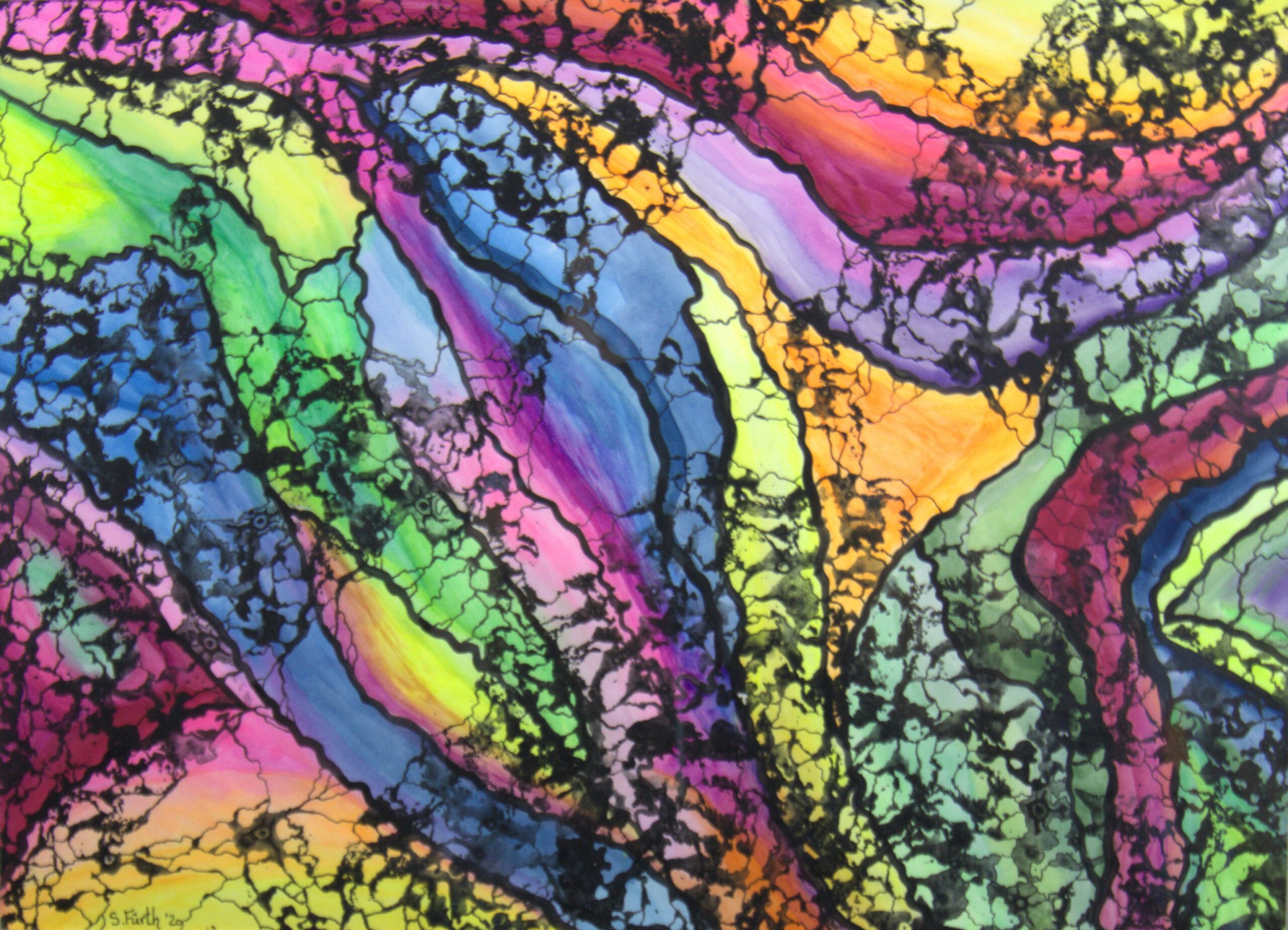 Das Aquarellbild ist ein faszinierendes Spiel aus Farben und Formen. Die leuchtenden, bunten Farbtöne strahlen Fröhlichkeit und Lebendigkeit aus, während die schwarzen, schwammähnlichen Strukturen dem Werk eine gewisse Tiefe und Komplexität verleihen. Diese filigranen Linien, die mit einem Fineliner ausgearbeitet wurden, schaffen Kontraste und betonen die organischen Formen, die sich harmonisch im Bild entfalten.