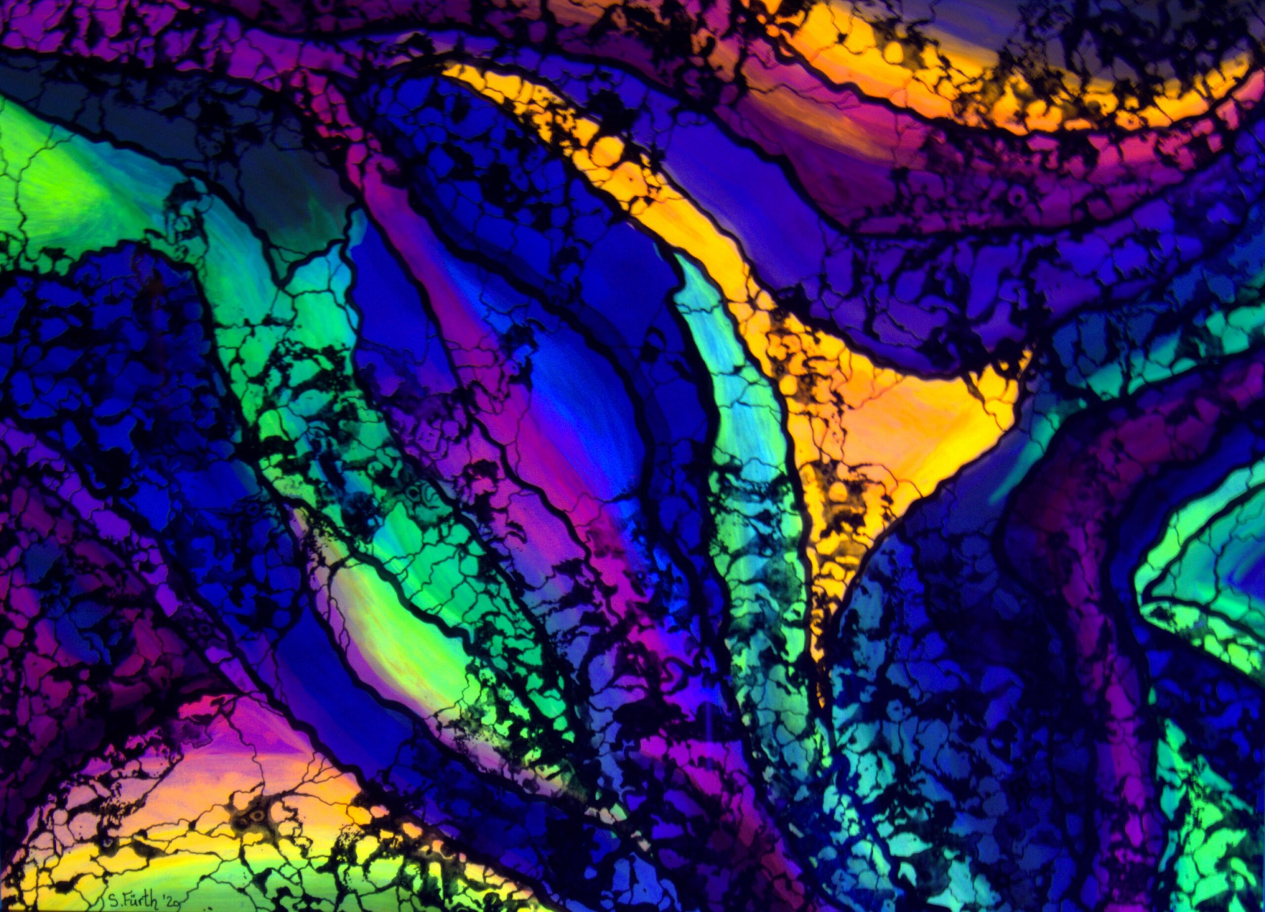 Unter Schwarzlicht wird das Bild zu einem noch intensiveren Erlebnis. Bestimmte Farben beginnen zu leuchten und wirken nahezu surreal, während andere in den Hintergrund treten und dem Gesamtbild eine geheimnisvolle Dimension verleihen. Die Kombination aus Aquarelltechnik und den präzisen Linien des Fineliners schafft eine einzigartige Balance zwischen Weichheit und Klarheit, die den Betrachter dazu einlädt, die verschiedenen Ebenen des Kunstwerks zu erkunden und in seine Farbenpracht einzutauchen.